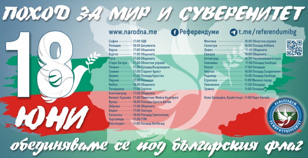 Следващият поход за мир ще е на 18 юни в централно Торонто, мястото и времето се уточняват и ще бъдат потвърдени след получаване на разрешение от полицията на Торонто. Можете да се свържете по всяко време с координаторите на инициативата, за да получите информация за подготовката: Стоян Богданов, тел. +1 416-992-8663, Илия Илиев, тел. +1 416-558-5323.